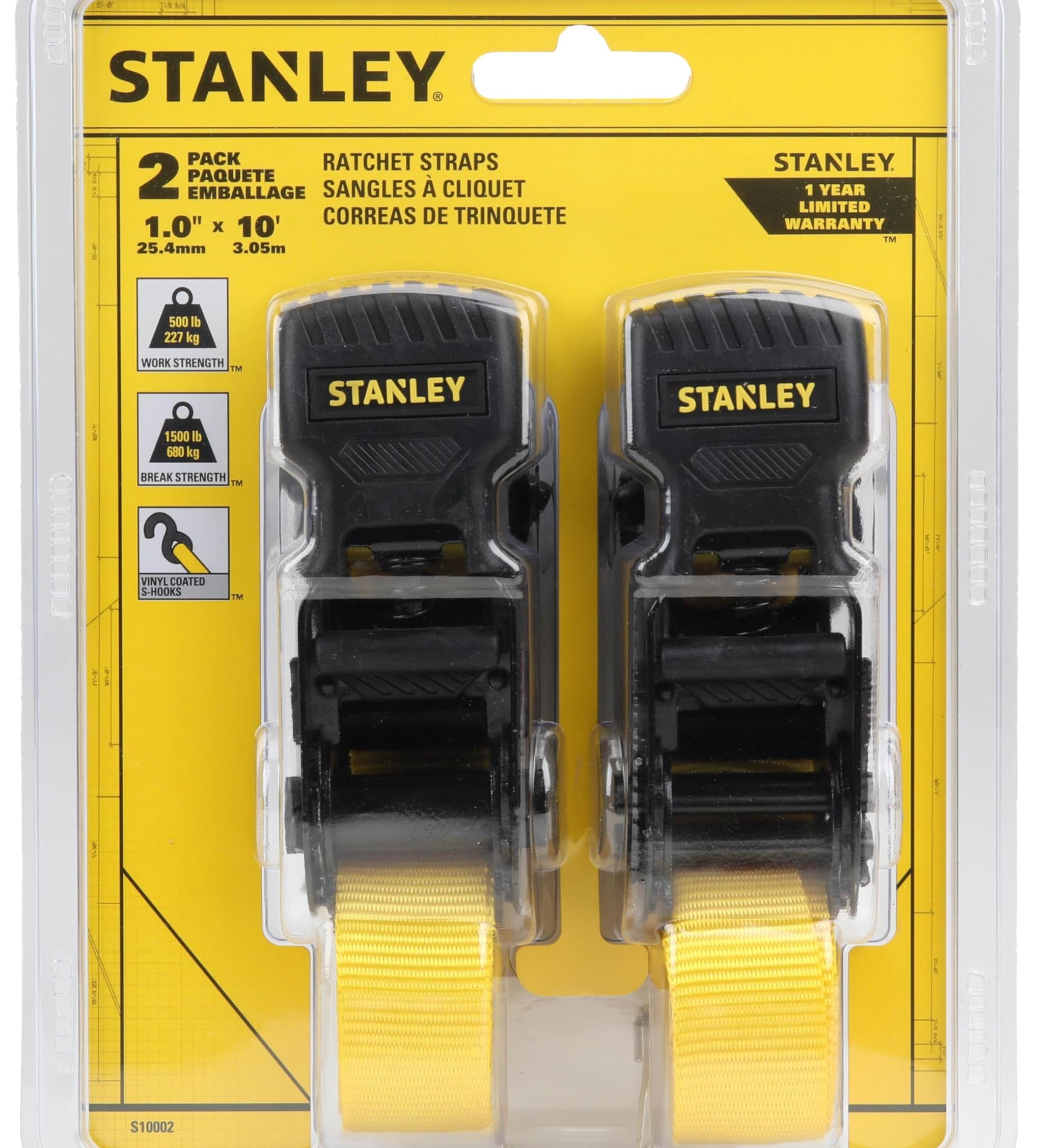 STANLEY S10002 Black/Yellow 1" x 10' Ratchet Tie Down Straps - 500 lb Safe Working Load / 1,500 lbs Break Strength, 2 Pack