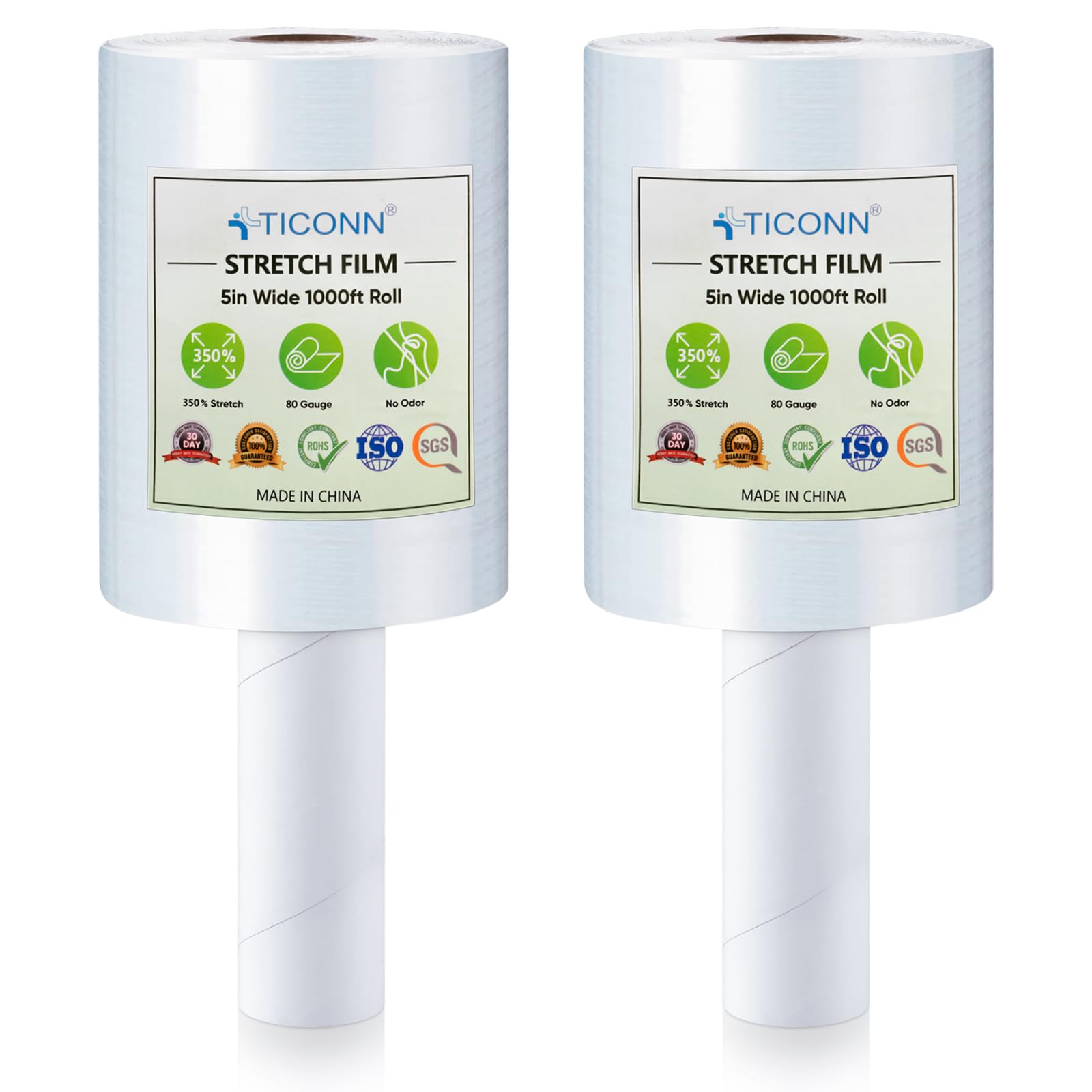 TICONN 2Pk Stretch Wrap Stretch Film Roll, 1000ft Industrial Strength 5 inch Wide Clear Plastic Wrap with Handles for Pallet Wrapping Shipping Moving
