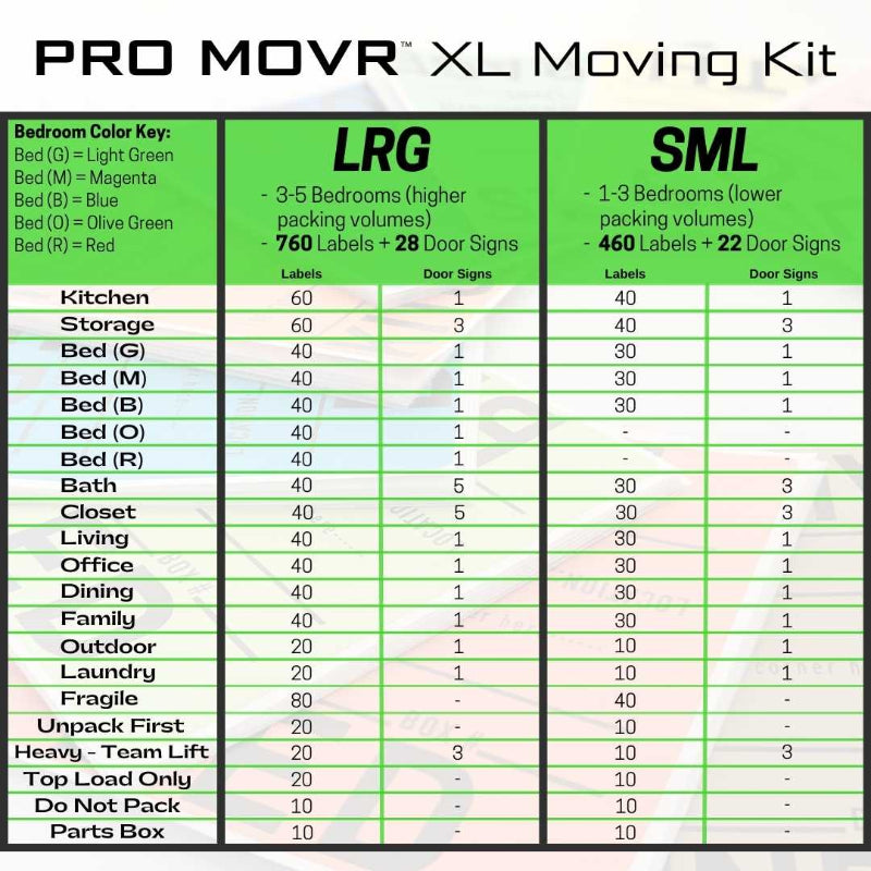 This will largely depend on: a) how you plan to relocate, and b) your new home’s size. For example, our LABEL HERO set is ideal for ANY type of move, and particularly for do-it-yourself movers who may only need the box labels. Our ROOM ID and PRO MOVR sets are ideal for professional moves because they enable your movers to work more efficiently and independently. We’ve broken down our sets into two sizes, but our quantities are meant to serve as rough estimates since lifestyles may vary.