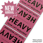 Three maroon labels with 'HEAVY TEAM LIFT REQUIRED' text on a white background